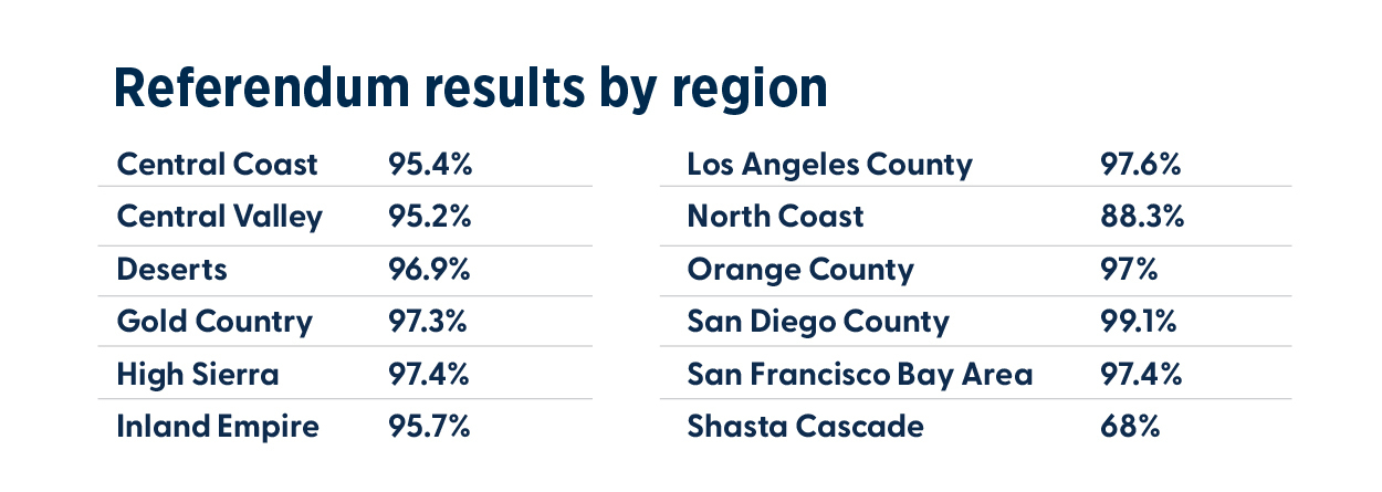 The industry delivered a landslide of support from every part of the state. All 12 tourism regions overwhelmingly voted to continue Visit California’s industry-led marketing programs.